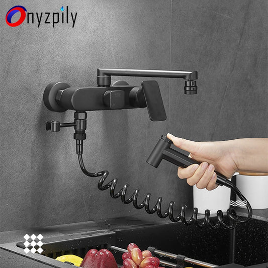 Matte Black Wall Mounted Kitchen Faucet Pull down Cold Hot Water Kitchen Taps 360 Rotation Dual Function Sprayer Taps